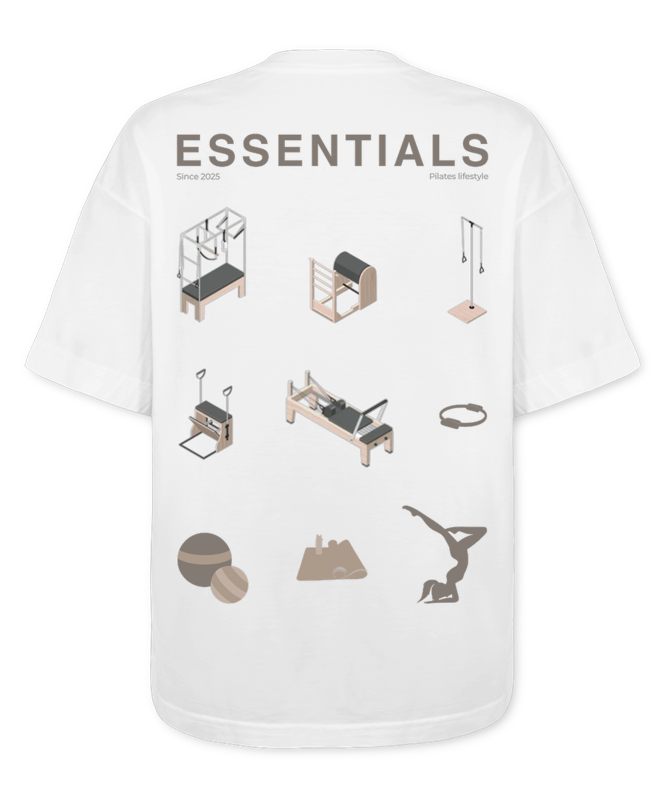 A oversized ESSENTIALS traduz o Pilates como um verdadeiro estilo de vida. A estampa minimalista une equipamentos icônicos do método a frases que reforçam a essência da marca: liberdade, movimento e propósito. Com modelagem ampla e confortável, é a peça perfeita para te acompanhar dentro e fora do studio — unindo estilo streetwear e lifestyle sofisticado.
